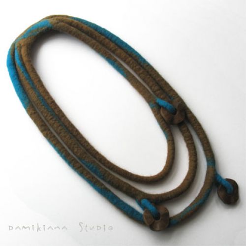 Naszyjnik wykonany z wełny, filcowany na mokro z dodatkami w postaci drewnianych koralików.