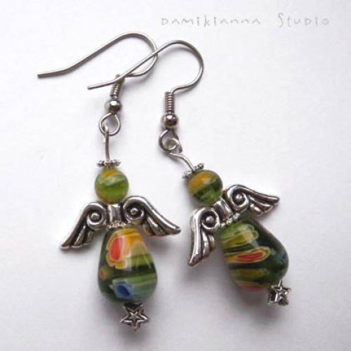Aniołki mają sukienki ze szklanych koralików typu Milefiori, skrzydełka metalowe (elementy typu Bali). Bigle kolczyków wykonane są ze stali chirurgicznej (antyalergicznej). Długość aniołka to 2,5 cm. Długość całkowita kolczyka 5 cm. | autor DAMIKIANNA STUDIODamikianna Studio to przymierze dwóch kobiet, ich wyobraźni, talentu i fascynacji światem.