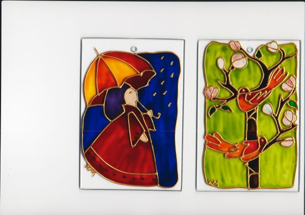 2 malowane "witrażyki" : Dziewczynka z parasolką" i "Ptaki"